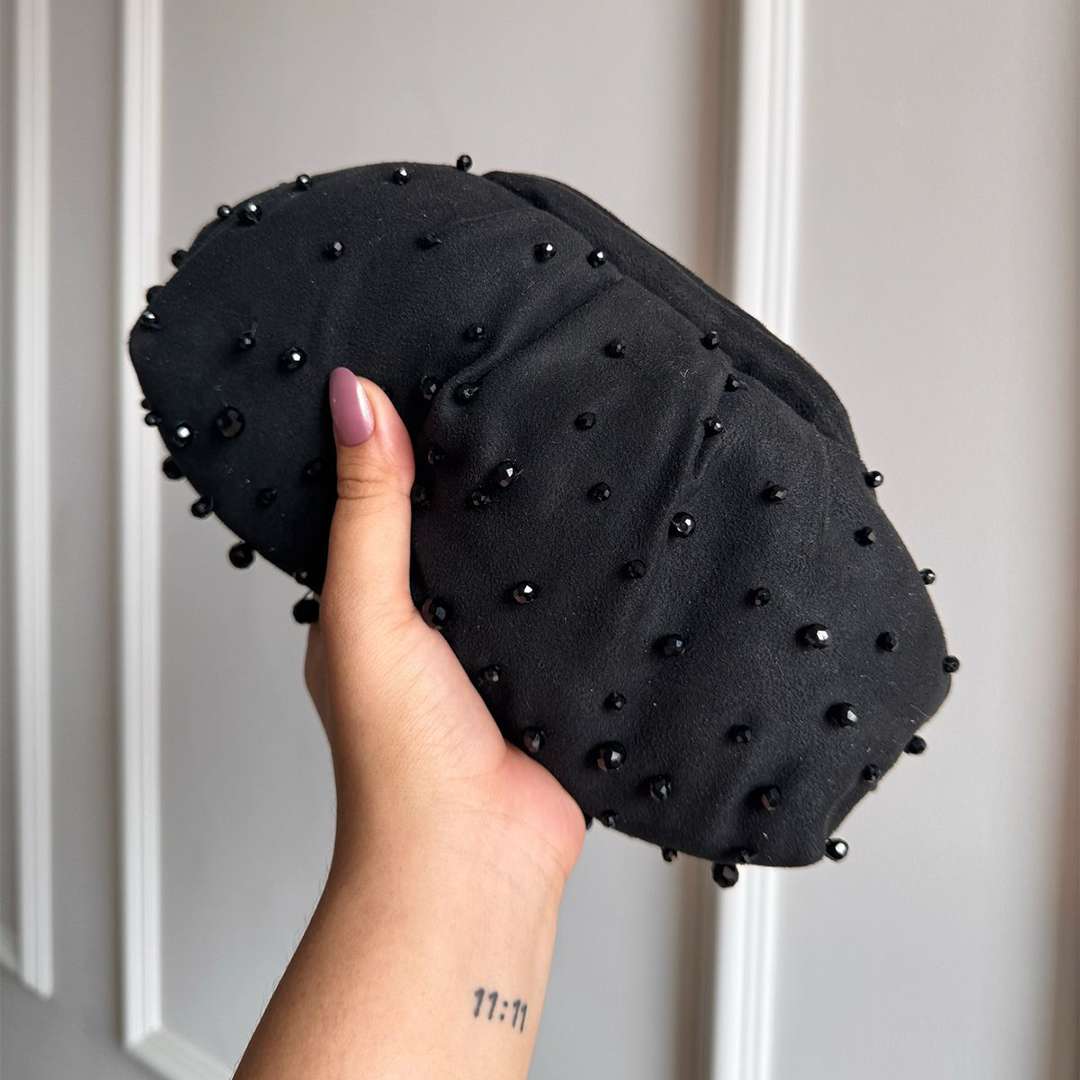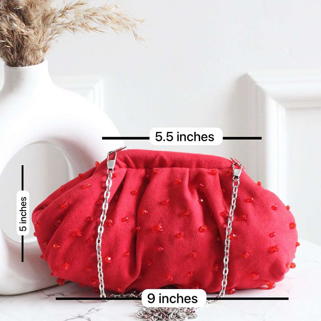 Step into elegance with the Suede Cloud Bag, crafted to make a statement wherever you go. Its soft suede fabric gives it a plush, cloud-like feel while the 5.5 x 5 x 9 inch structure offers ample space for your essentials. With identical embroidery on both sides, this bag ensures you look good from every angle. The attached sling chain adds a modern twist, making it perfect for festive outfits, party wear, or even a chic casual look.