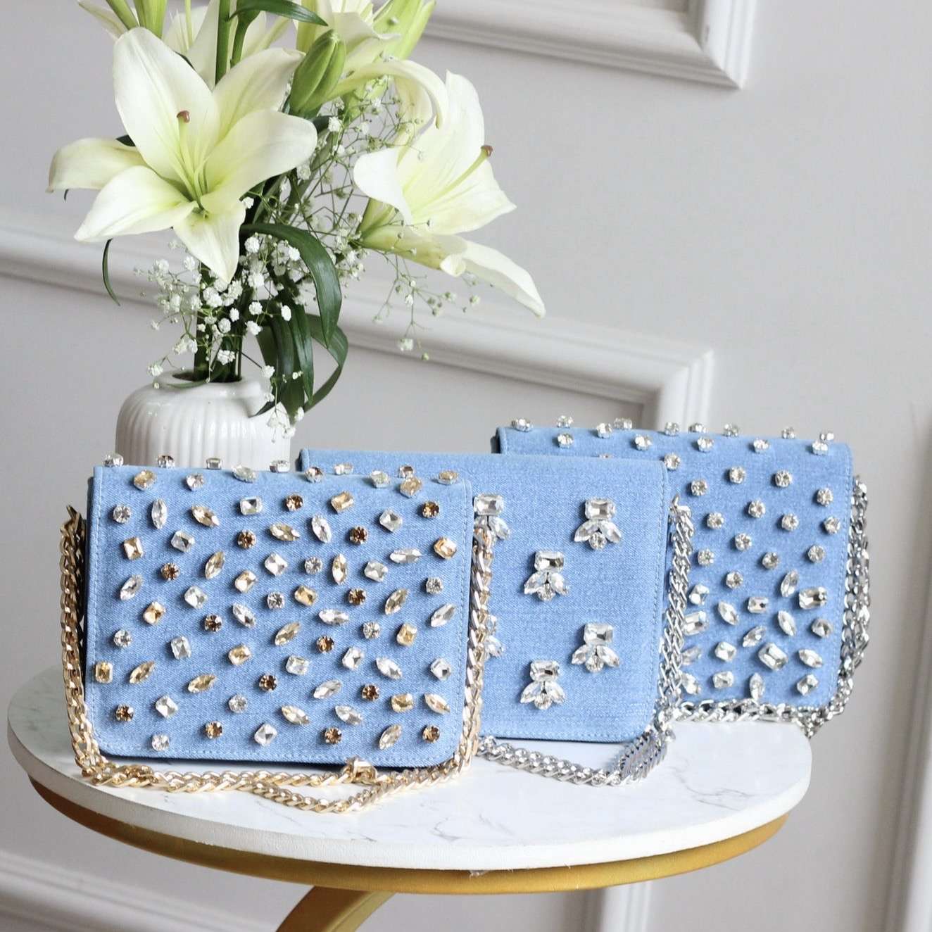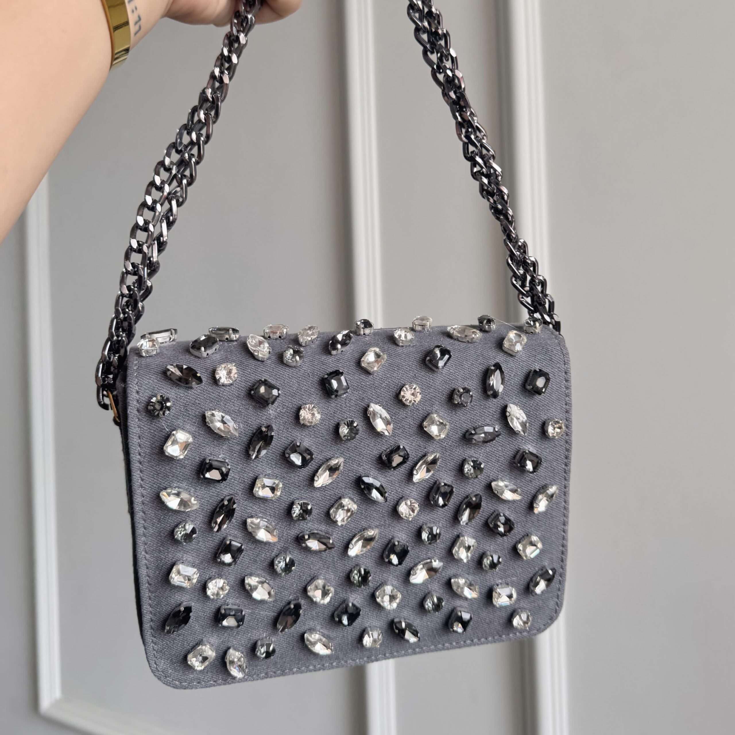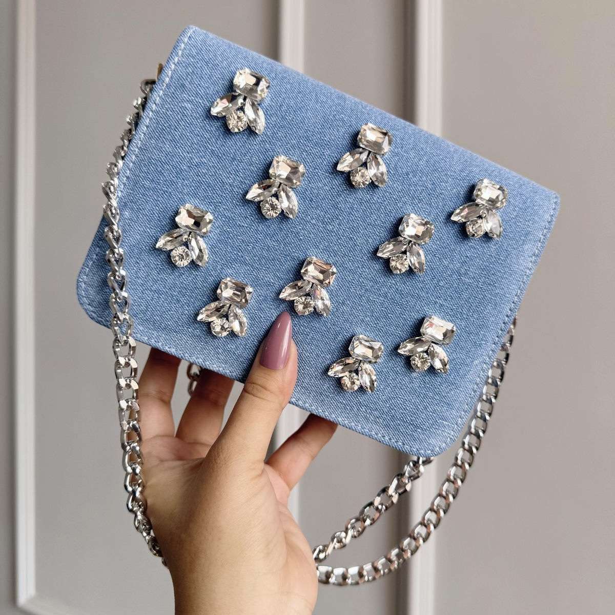 Shine bright and turn heads wherever you go with this must-have crystal denim clutch!