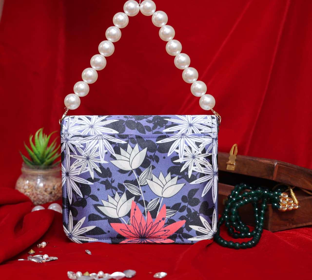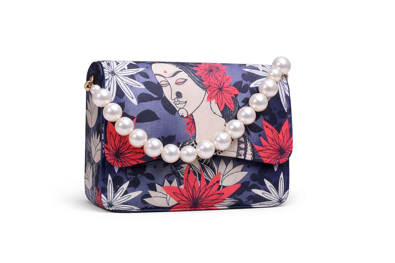 Elegant and artistic, the Floral Flap Clutch is designed to make a bold style statement. Featuring a striking floral and portrait-inspired print this clutch blends contemporary art with fashion. The oversized pearl handle adds a touch of sophistication, making it both stylish and distinctive.