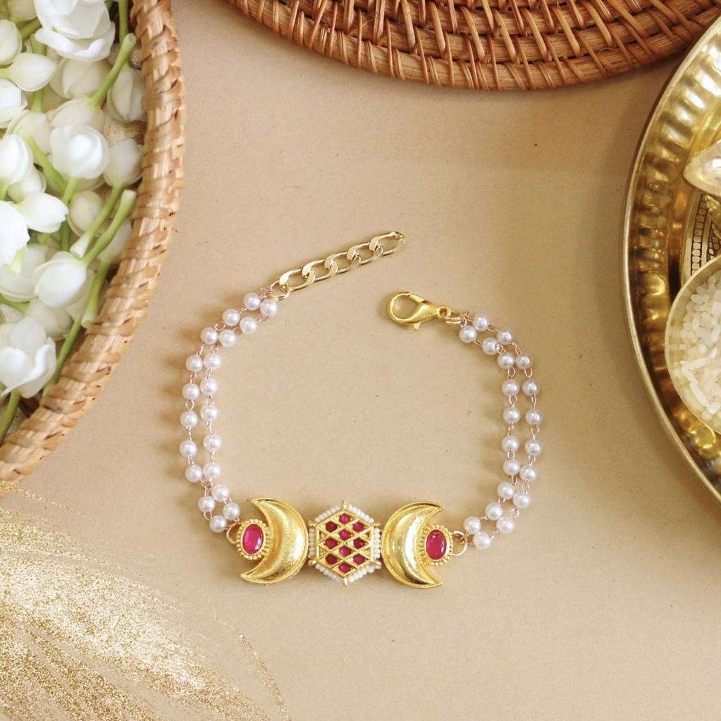 🌙 Intricately handcrafted with pearl beads, crescent moon charms, and vibrant centerpiece stones, these Rakhis are designed to blend tradition with elegance.