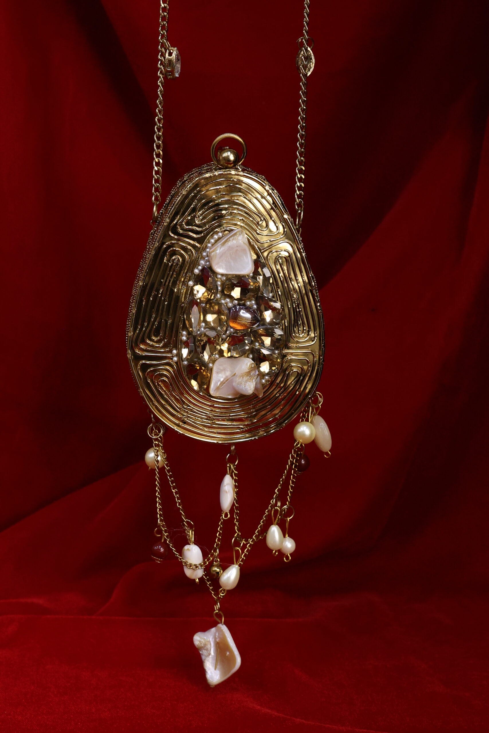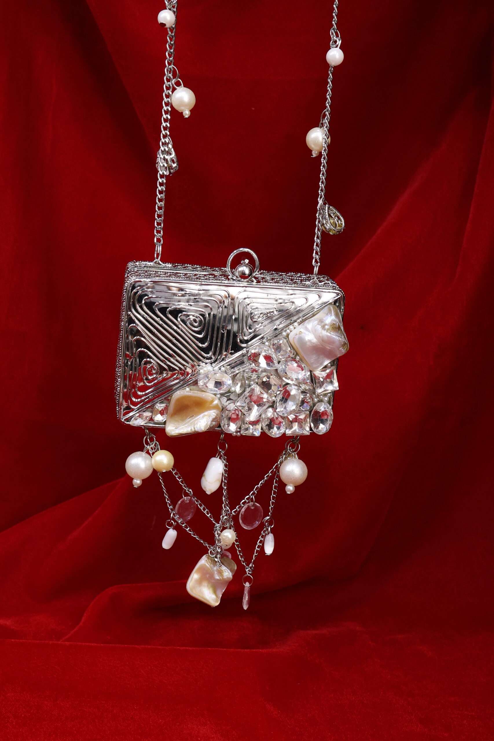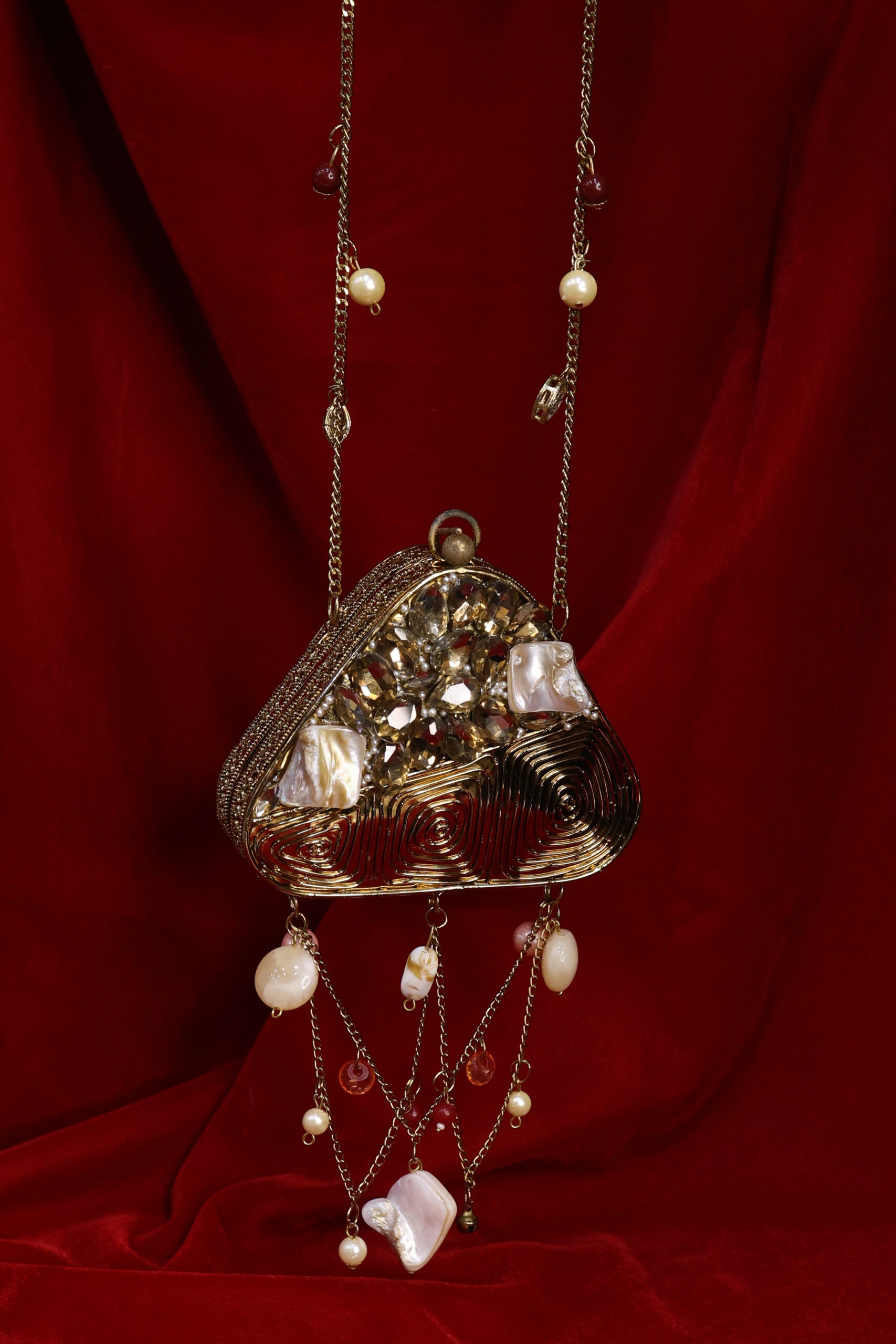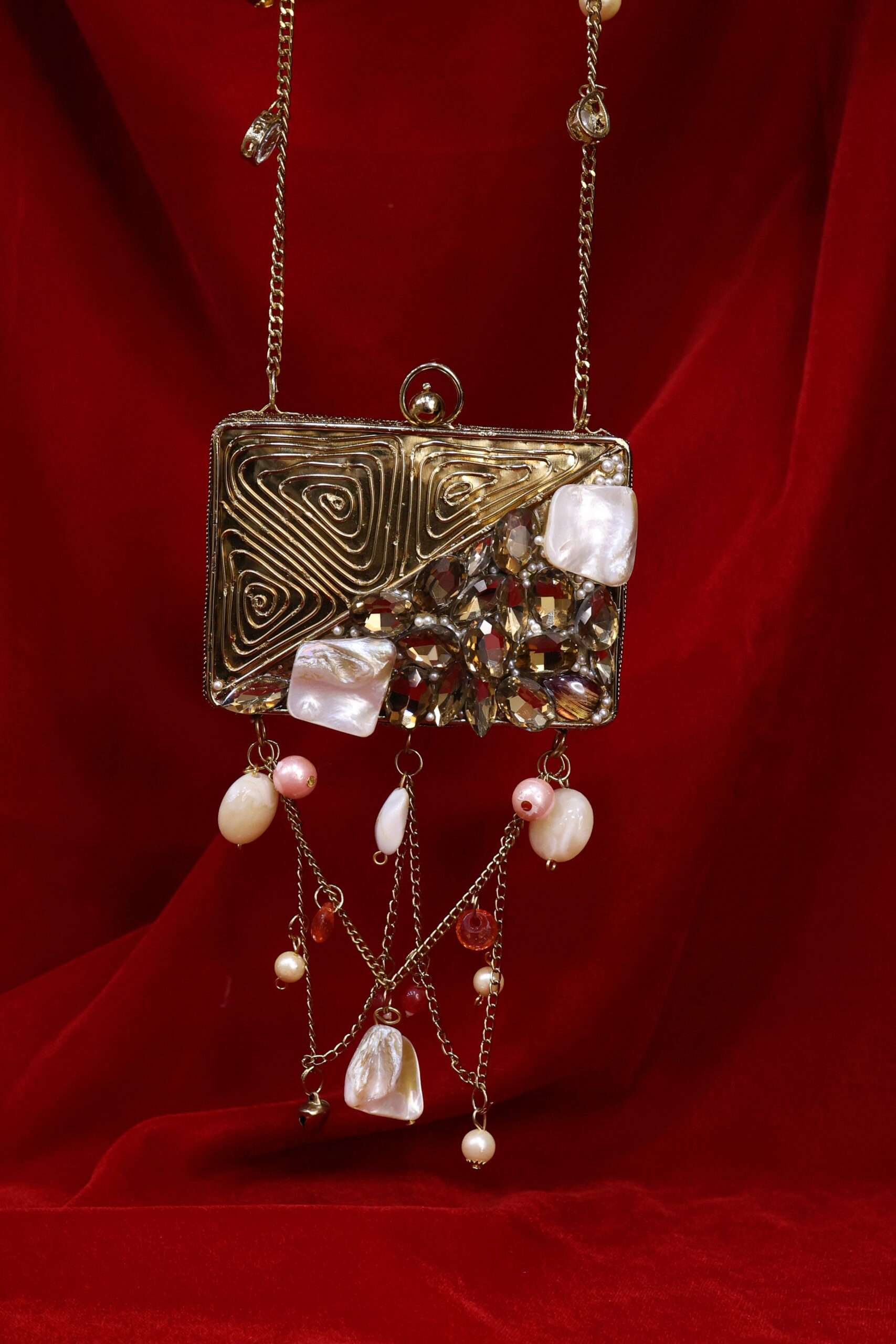 A masterpiece that beautifully blends elegance with artistry. This clutch features a golden swirl design, reminiscent of a royal nest, cradling raw stones and lustrous pearls at its heart. Finished with delicate pearl hangings, it adds a touch of charm and sophistication to your look. Perfect for brides, festive occasions, or evening soirées, Regal Nest is more than a clutch – it’s a statement piece.