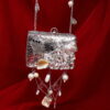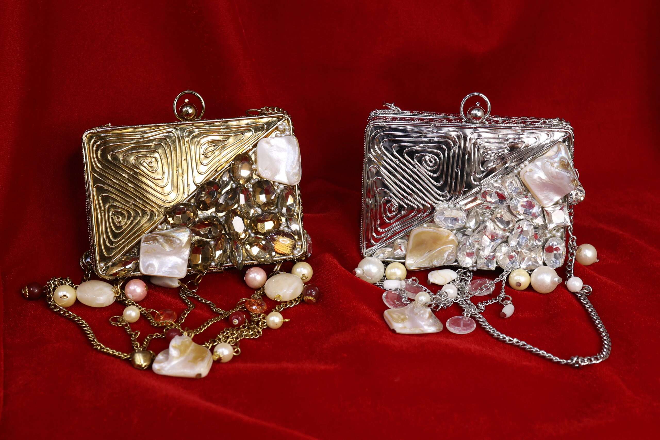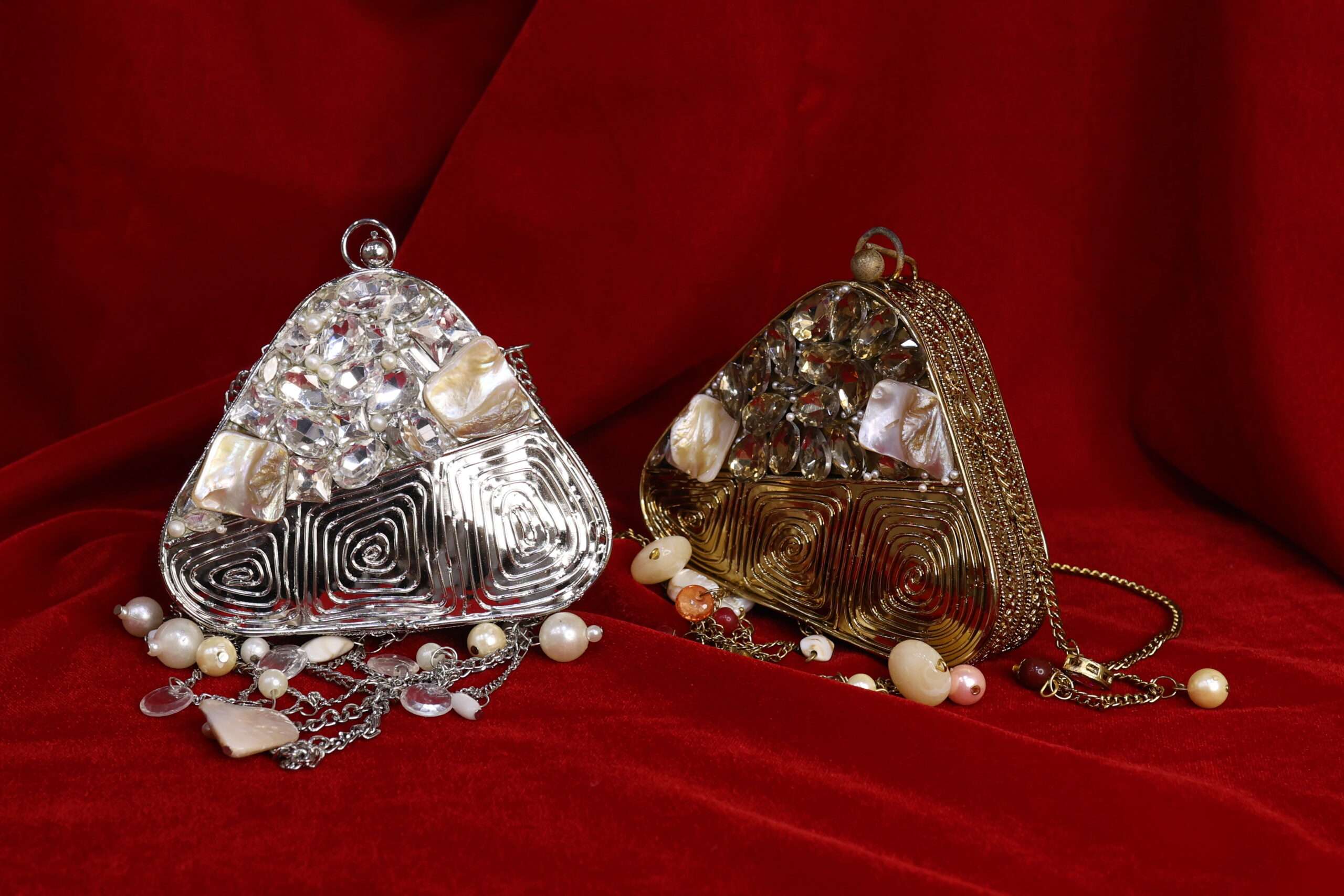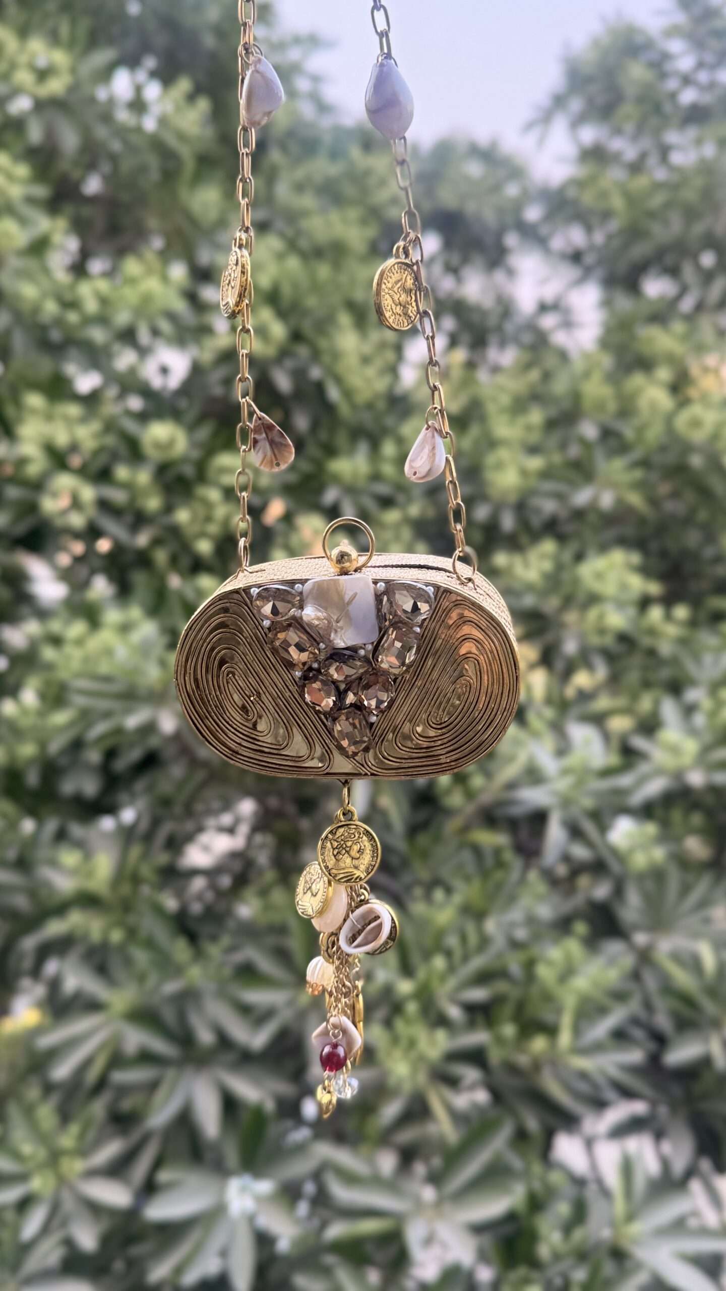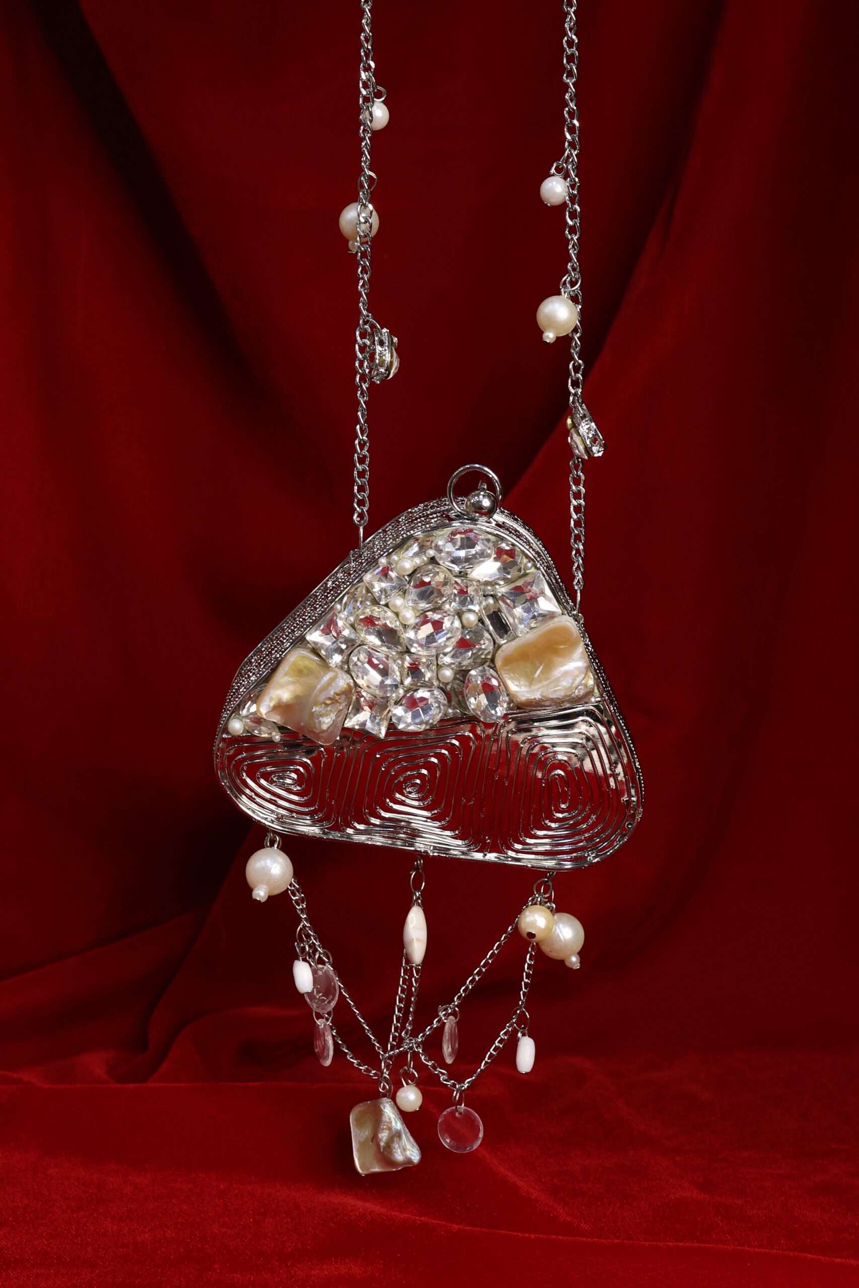 A masterpiece that beautifully blends elegance with artistry. This clutch features a golden swirl design, reminiscent of a royal nest, cradling raw stones and lustrous pearls at its heart. Finished with delicate pearl hangings, it adds a touch of charm and sophistication to your look. Perfect for brides, festive occasions, or evening soirées, Regal Nest is more than a clutch – it’s a statement piece.