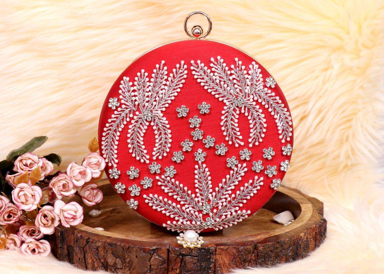 Add a refined touch to your ensemble with these handcrafted round clutches. Featuring exquisite craftmanship on the front side, meticulously detailed to create a chic and opulent look. The back side of all clutches is kept plain for a minimalist finish and enhanced comfort in carrying. Perfect for ethnic celebrations, weddings, parties, or evening outings, these clutches combine traditional artistry with modern elegance.