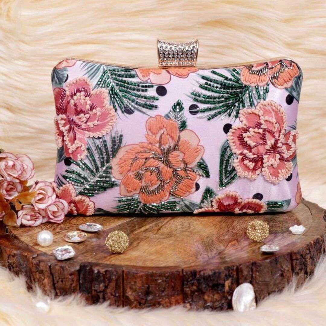 Make a statement with our exquisite floral embroidered clutch, designed to bring elegance and charm to your ensemble. This beautifully crafted piece features detailed embroidery on a soft printed fabric, showcasing vibrant florals and lush green foliage. The back of the clutch is finished in matching printed fabric for a seamless and stylish look.
