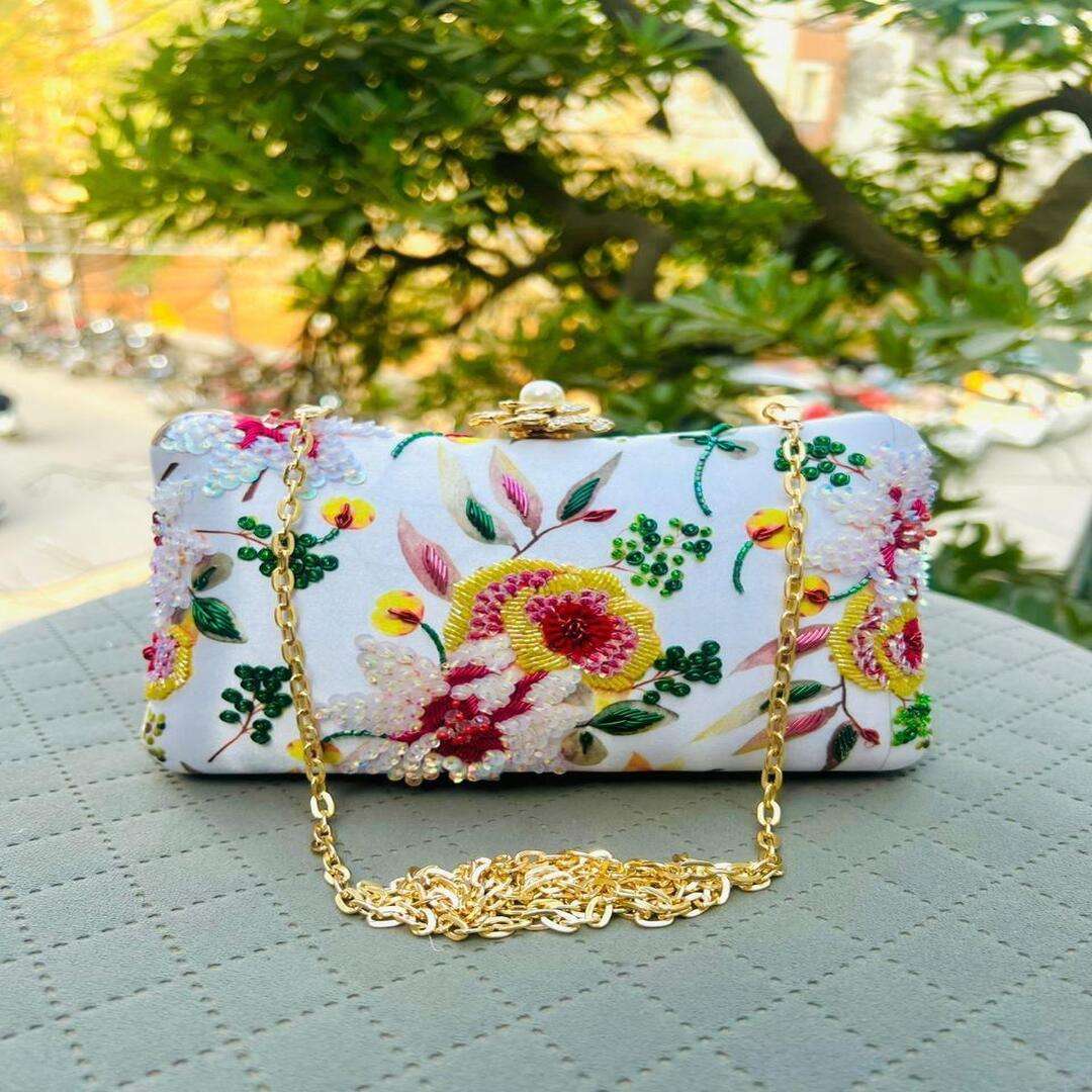 Make a statement with our exquisite floral embroidered clutch, designed to bring elegance and charm to your ensemble. This beautifully crafted piece features detailed embroidery on a soft printed fabric, showcasing vibrant florals and lush green foliage. The back of the clutch is finished in matching printed fabric for a seamless and stylish look.