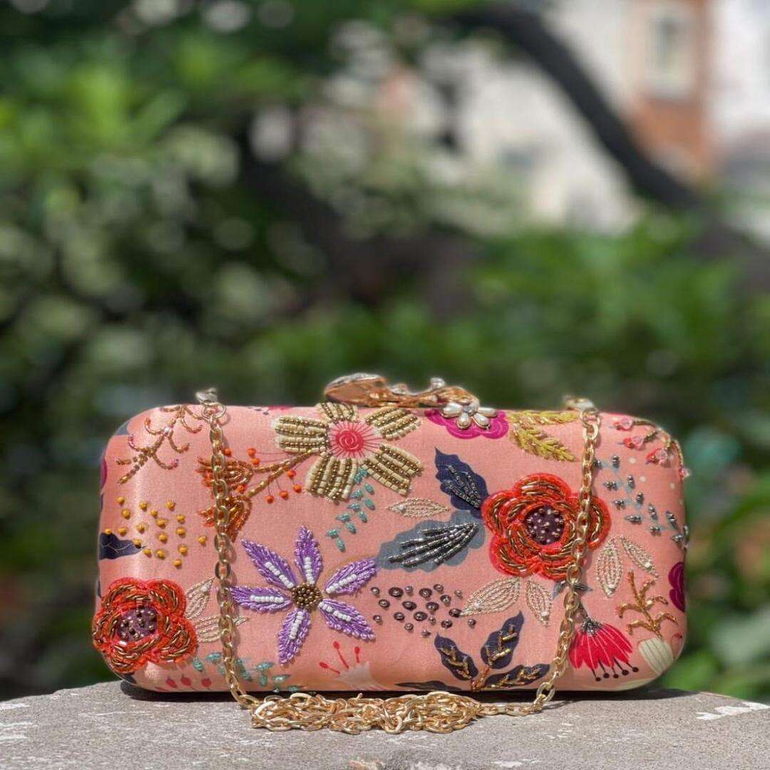 Make a statement with our exquisite floral embroidered clutch, designed to bring elegance and charm to your ensemble. This beautifully crafted piece features detailed embroidery on a soft printed fabric, showcasing vibrant florals and lush green foliage. The back of the clutch is finished in matching printed fabric for a seamless and stylish look.