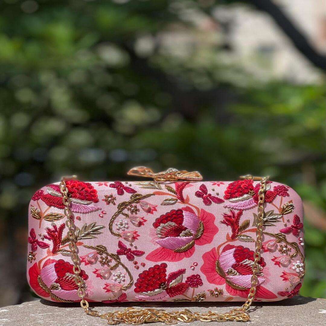 Make a statement with our exquisite floral embroidered clutch, designed to bring elegance and charm to your ensemble. This beautifully crafted piece features detailed embroidery on a soft printed fabric, showcasing vibrant florals and lush green foliage. The back of the clutch is finished in matching printed fabric for a seamless and stylish look.
